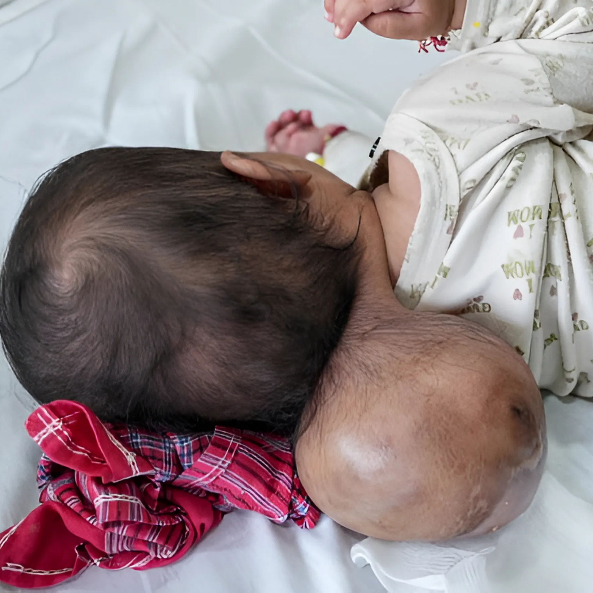 My baby hasn’t seen the world properly—her head is always bent down because of the tumour.